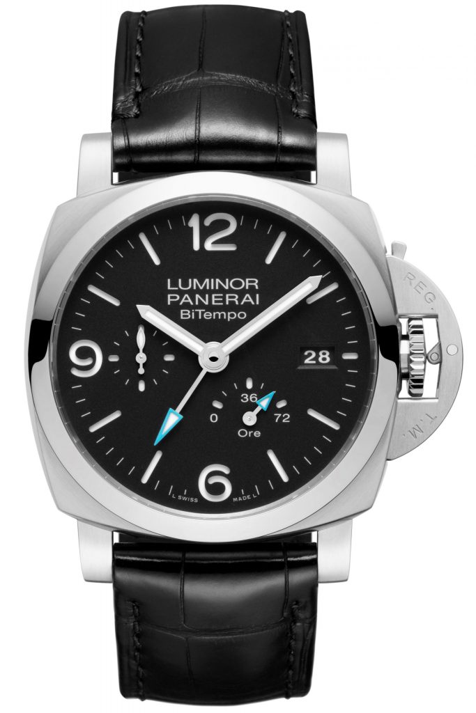 O novo relógio foi interpretado em duas paletes de cores distintas, cada uma com uma presença convincente e segura, criadas com base na caixa em aço de 44 mm. O primeiro é centrado num mostrador azul vibrante escovado com uma pulseira de crocodilo no mesmo tom rico (PAM01361); o segundo tem um mostrador preto fosco e uma pulseira de crocodilo a combinar (PAM01360). Em ambas as cores, o Luminor BiTempo possui uma função GMT que indica a hora num segundo fuso horário com um ponteiro azul ciano vívido para garantir a visibilidade num relance.