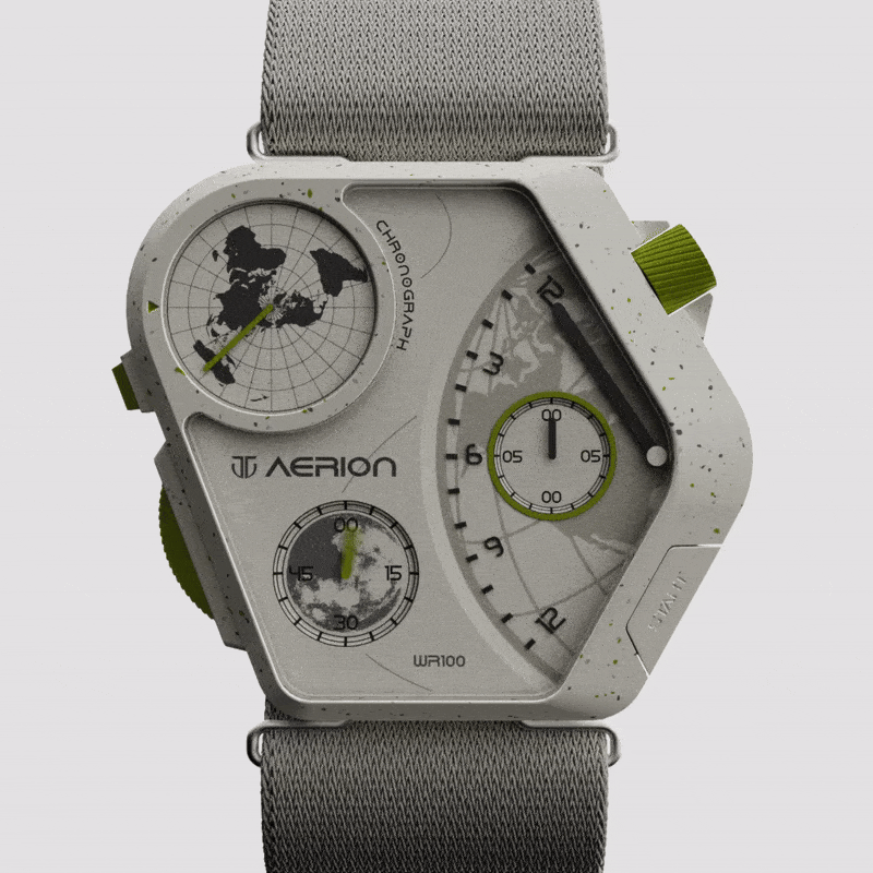 O relógio Aerion de Suryawanshi cativou os jurados por seu design não convencional que combinou novas tecnologias com formatos exclusivos e uma linguagem de design brutalista atraente que ainda conseguiu ser ao mesmo tempo emocionante e prática. O relógio apresenta um design cativante com um mostrador semicircular à direita marcando as horas e um mostrador menor à esquerda para os minutos. Evocando a interação entre a Terra e a Lua, estes mostradores ilustram de forma encantadora a órbita lunar. Incorporando praticidade, dois botões flanqueiam o relógio para ativar a função cronógrafo. Esse recurso transforma perfeitamente o ponteiro dos minutos em um ponteiro de segundos para uma cronometragem precisa, auxiliado por um mostrador secundário que mede intervalos de meio segundo na exibição das horas. Um disco superior direito no mostrador do relógio apresenta elegantemente um mapa com longitudes cruciais, ao lado de um ponteiro giratório que indica a posição do sol acima, indicando a hora solar local. Notavelmente, a moldura externa do disco também inclui uma seta discreta para referência de localização do usuário.